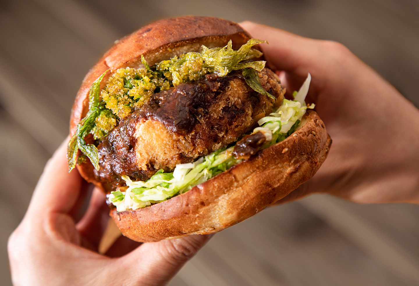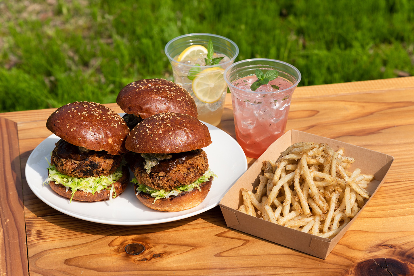 We are pleased to introduce “TSUMARI BURGER: Special Minced-mead Cutlet of Tsumari Pork”from 22 July, a new menu supervised by chef, YONEZAWA Fumio. Mr Yonezawa who has been engaging with Echigo-Tsumari since 2015 has built deep understanding and knowledge of local ingredients of Echigo-Tsumari. He has come up with a new burger using soft-juicy Tsumari pork cutlet sandwiched in the home-made crispy buns. Fukinoto, one of the mountain vegetables being picked up by locals is served as a side (fried) and condiment (miso demi-glace sauce).