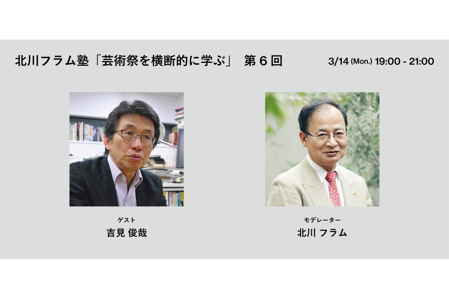 第6回目のフラム塾では、日本を代表する社会学者で東京大学大学院情報学環教授の吉見俊哉さんをお呼びします。吉見さんの視点から、芸術祭で展示されるアート/上演されるパフォーマンスがその土地とそこで暮らす人々にもたらす影響や、実際に芸術祭を訪れて感じたことなどについてお話しいただきます。