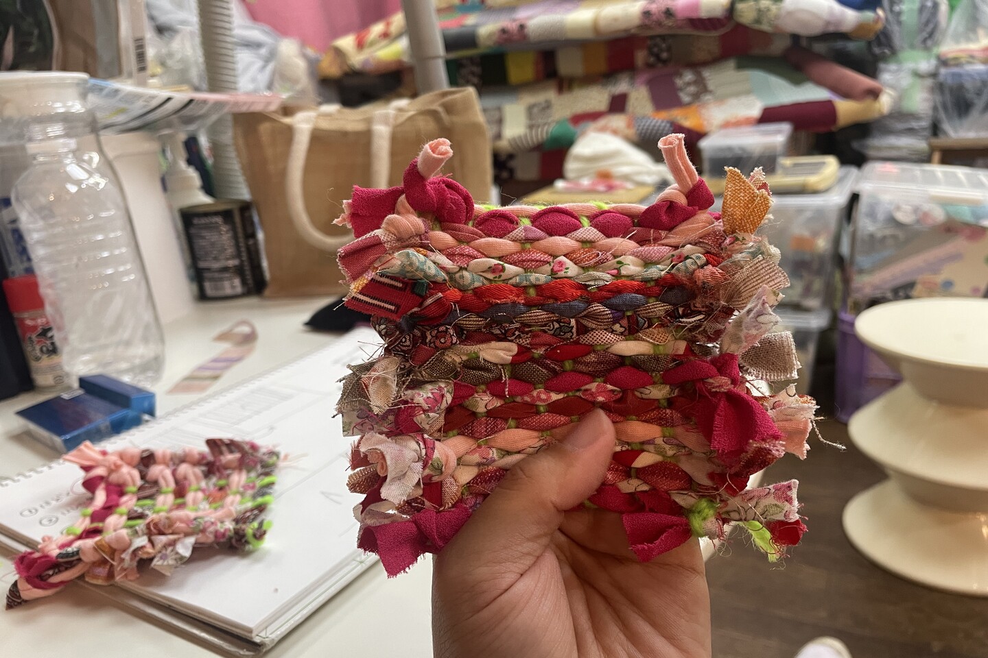 今回のワークショップでは、展示期間中に来場者によって編まれた古布の編み物を整えたり、コースターほどの大きさの編み物をつくり、展示に追加します。