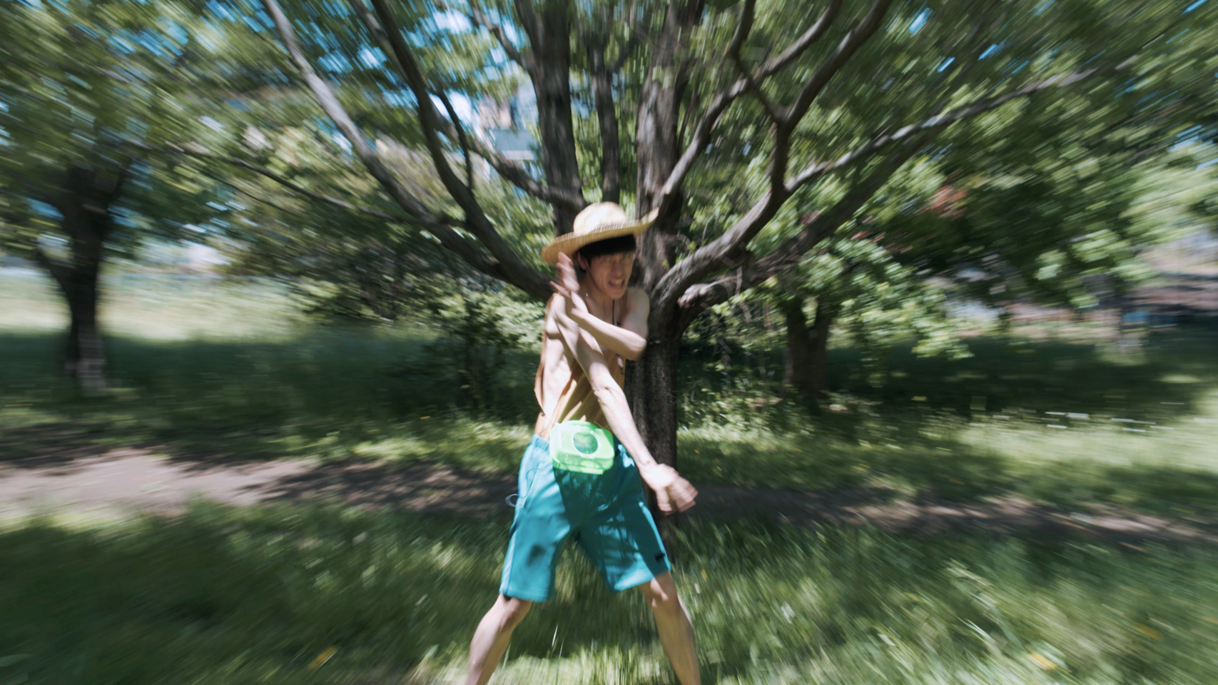 動画をつくって共有することが当たり前の映像文化の中で育ったアーティスト、それが倉知朋之介です。倉知がつくる映像作品では、彼自身が主演と演出を担当し、なにかに扮した人物が、よくわからない言語をペラペラと話しながらシーンがスピーディーに展開します。動きは全体にオーバーで、衣装やメイクのつくりも(あえて)雑な感じ。物語の内容がなんであるかは勝手に推測するほかありませんが、「笑い」を大事にしていることもあってか、見終わった後は、妙な満足感と荒唐無稽な印象とがない交ぜになった不思議な感覚が訪れます。