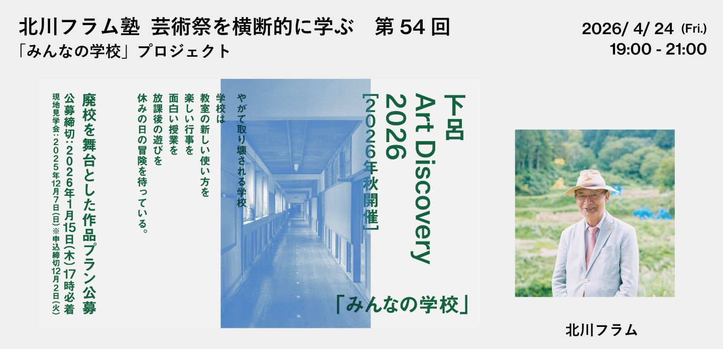 前回に引き続き、「北川フラム塾 芸術祭を横断的に学ぶ」は、芸術祭に関する様々な分野の専門家にお話を聞くとともに、「大地の芸術祭」だけでなく他の地域の芸術祭(「瀬戸内国際芸術祭」や「奥能登国際芸術祭」など)に関する取り組みも紹介していきます。