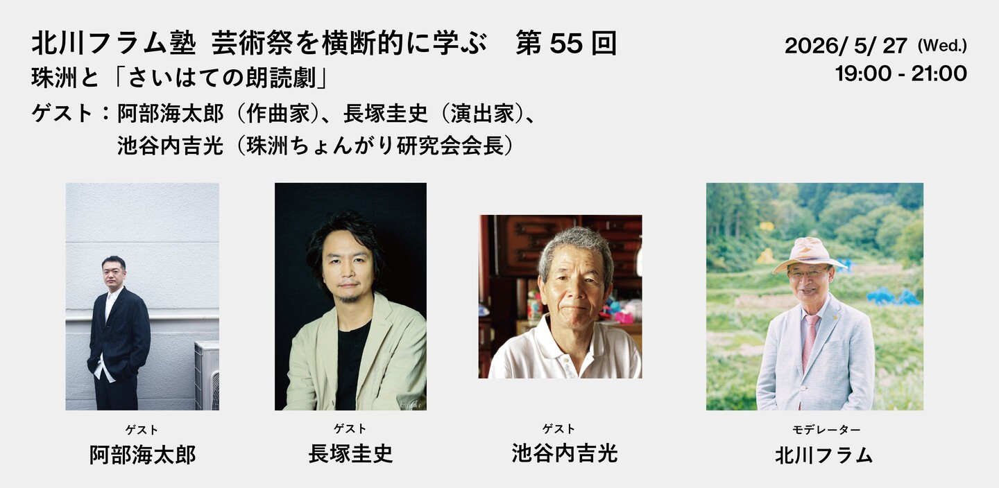 珠洲の暮らしや民話、民謡などの調査を経て創作され、スズ・シアター・ミュージアムで2022年に上演された「さいはての朗読劇 『珠洲の夜の夢』」にて、企画・音楽を担当された阿部海太郎氏と構成・演出を担当された長塚圭史氏、さらに珠洲ちょんがり研究会会長である池谷内吉光氏の3名をゲストにお迎えし、トークセッションとパフォーマンス(朗読:長塚圭史 演奏:阿部海太郎 民謡:池谷内吉光)を一挙にお楽しみいただけます。