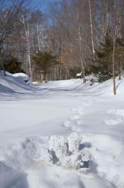 雪上で見つけた動物の足跡。それらは次第に風化し、やがて消えていくが、動物たちの生きた痕跡である。そんな刹那的な痕跡を、そのままの形で型取りし、裏返す。動物が踏むことで生まれた空間が、型によって反転し、彫刻として立ち上がる。常に生まれては消える生命の証を残す作品。