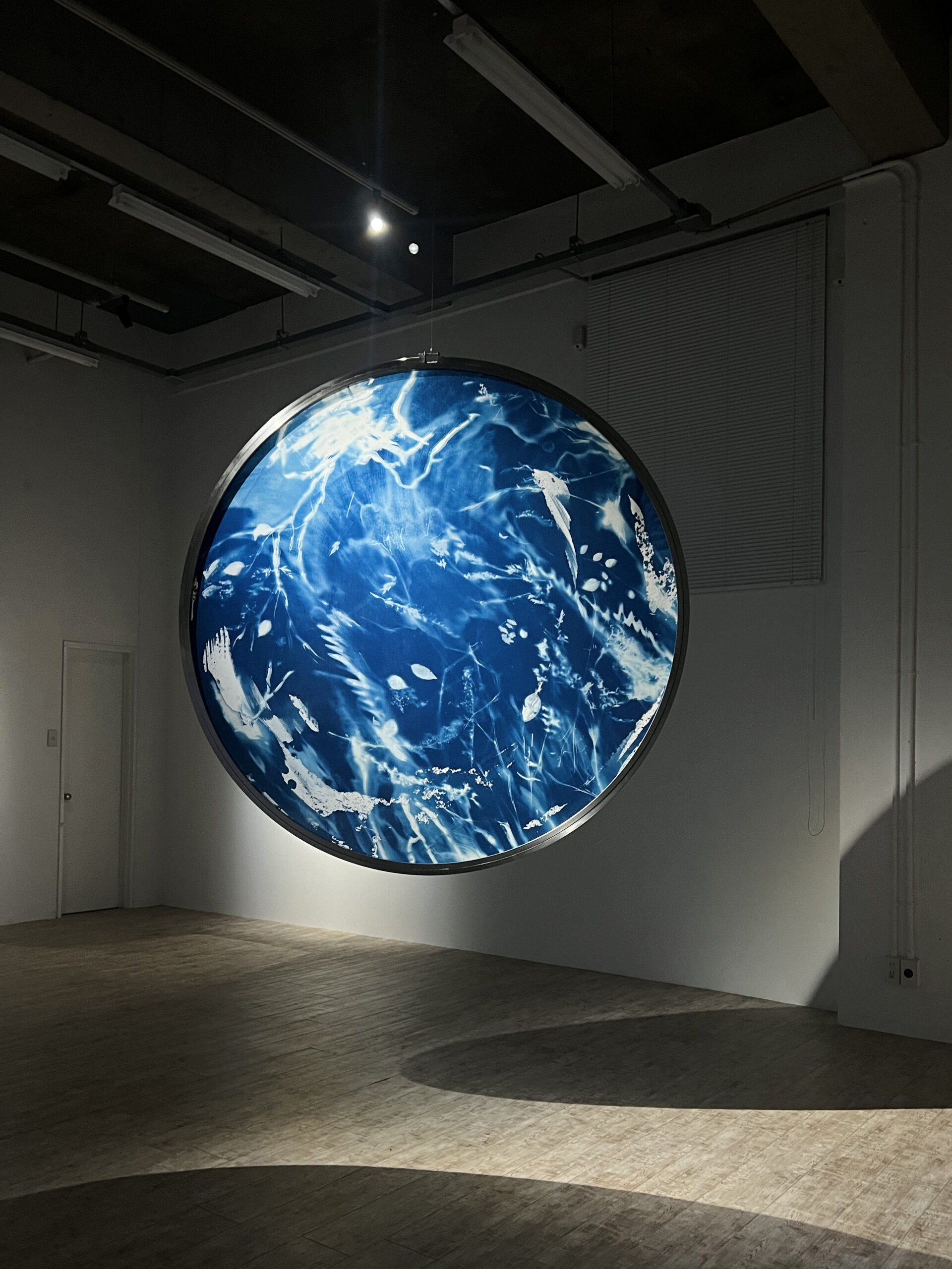 植物のシルエットやドローイングの筆跡を織り交ぜ、サイアノタイプの技術を活かした作品。越後妻有の自然や植物、雪などのモチーフを取り入れる。