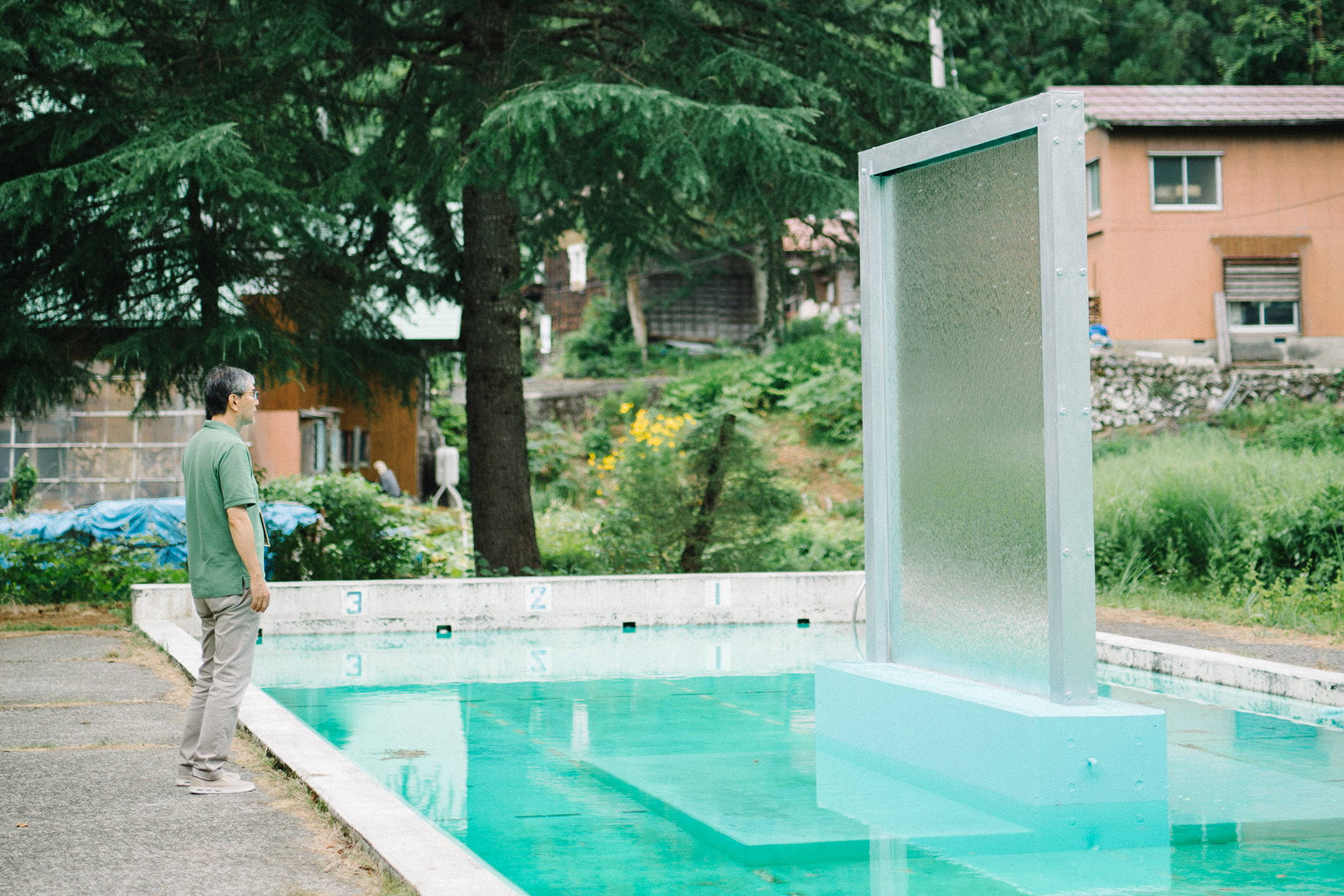 「카타쿠리노야도」 운동장 구석에 남은 물의 풀에 자리한 작품. 물속에서 수면을 올려다보면 반사되는 빛과 풍경이 흔들리는 듯 보인다. 예전 학생들도 보았을 그 흔들리는 풍경을, 유리 위에 물을 흘려 재현해보고 싶다고 작가는 생각했다. 다행히 수원이 산 중턱에 있어 고저차에 의한 수압을 이용해 퍼 올릴 수 있었다.어느 날, 유리 속 물이 뚝 멈춰 버리는 해프닝이 발생했다. 추석 연휴로 마을 인구가 늘어나 많은 물이 사용되면서 수량이 일시적으로 부족해진 탓이었다. 작품과 마을 생활이 연결되어 있음을 실감할 수 있는 사건이었다.