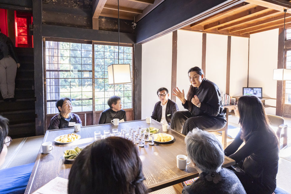 一通り館内を観たあと、管理人さんたちとマグネットウォーターの置かれた机を囲んで茶話会が始まった。最初に「夢」についてお母さんたちに尋ねたり、稲作や集落の状況について細かく聞いたりしていた。そして「越後妻有のお米はこれまで食べた米のなかで一番おいしい」と言い、マリーナの故郷や100歳を超えて生きた祖母の話をした。通訳を介しての会話だったが、緊張していた管理人さんたちも、自然に話をしていた。年齢の話になりマリーナと3名の管理人はほぼ同年齢という話に。生きてきた人生は違うけれど、いま「夢の家」で少しの時間、お茶のおともの柿や松之山のしんこもちを食べ、お土産で渡した集落産の米や25年の記録写真のアルバムなどを見ながら、話は弾む。マリーナは時々ジョークを交えるなど、ひとときの温かい時間が流れた。「次は25年を待たずにすぐ来るわ」と言って、最後に記念撮影をし、また玄関で一人一人にハグをして見送った。