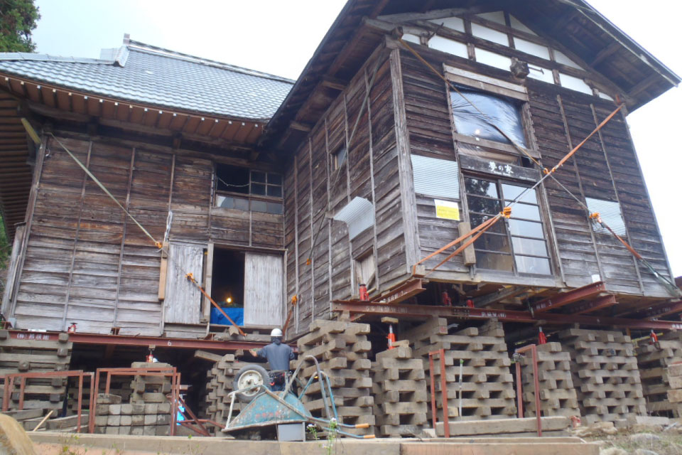 家を持ち上げ、基礎から改修する大規模な工事となった