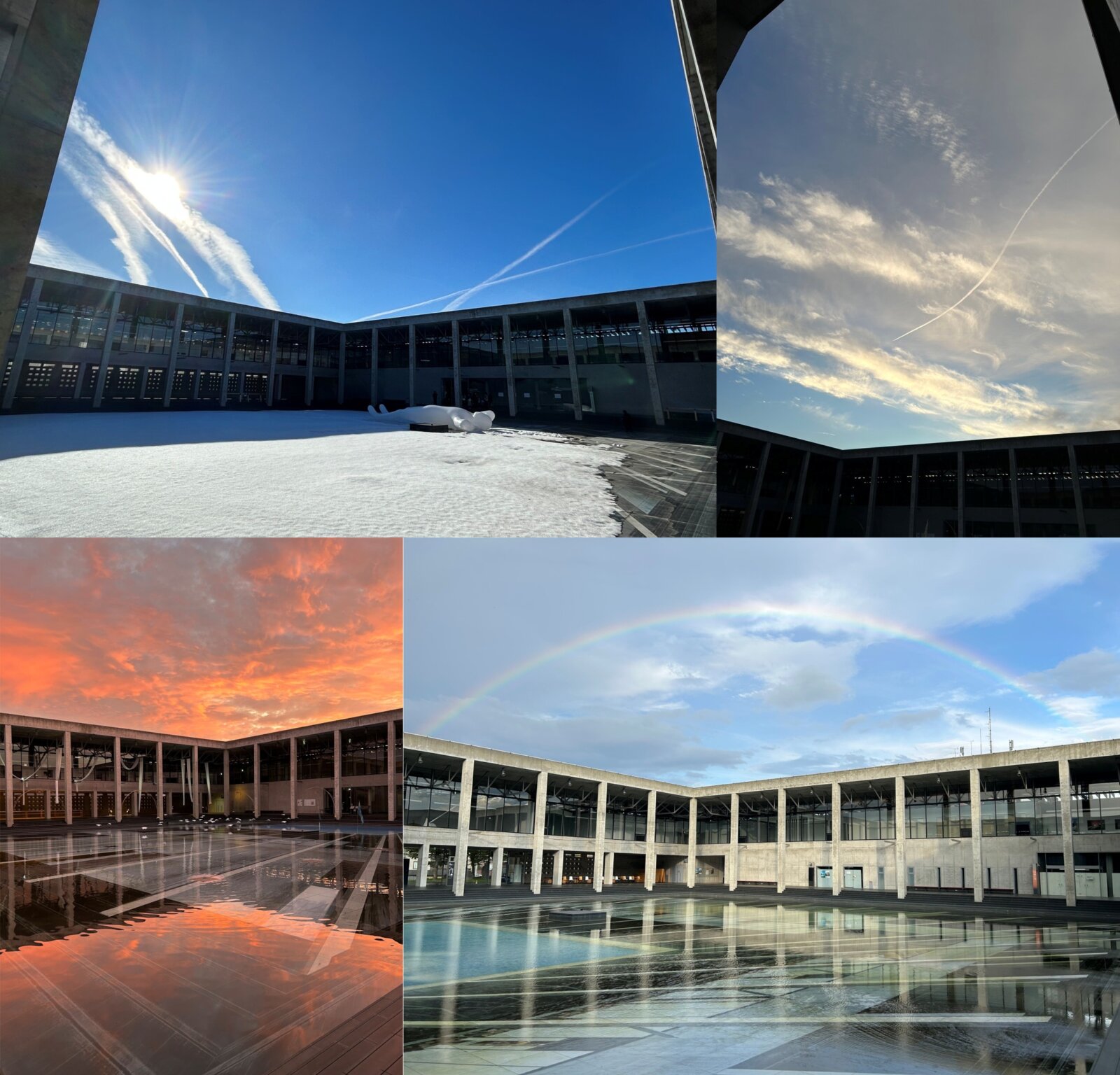 池の真上は吹き抜けで、空が見える。それはまるで建物で四角く切り取られたキャンバスのようで、雲のかたちや空の色が移りかわっていく。特に夕方の空は格別で、毎日の楽しみでもある。最近は、秋の虫やカエルの声も加わって癒されている。