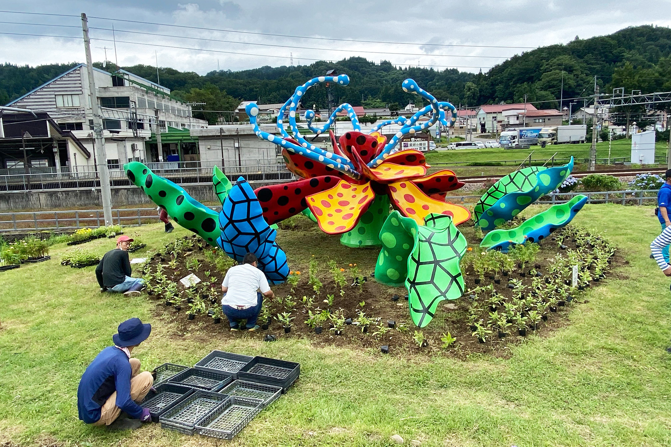 代表日本的艺术家草间弥生的作品《花开妻有》。自2003年创作以来,通过周边环境的除草、花卉养护、清洁维护及防雪围护等细致管理,已成为越后妻有艺术节最具代表性的人气作品。